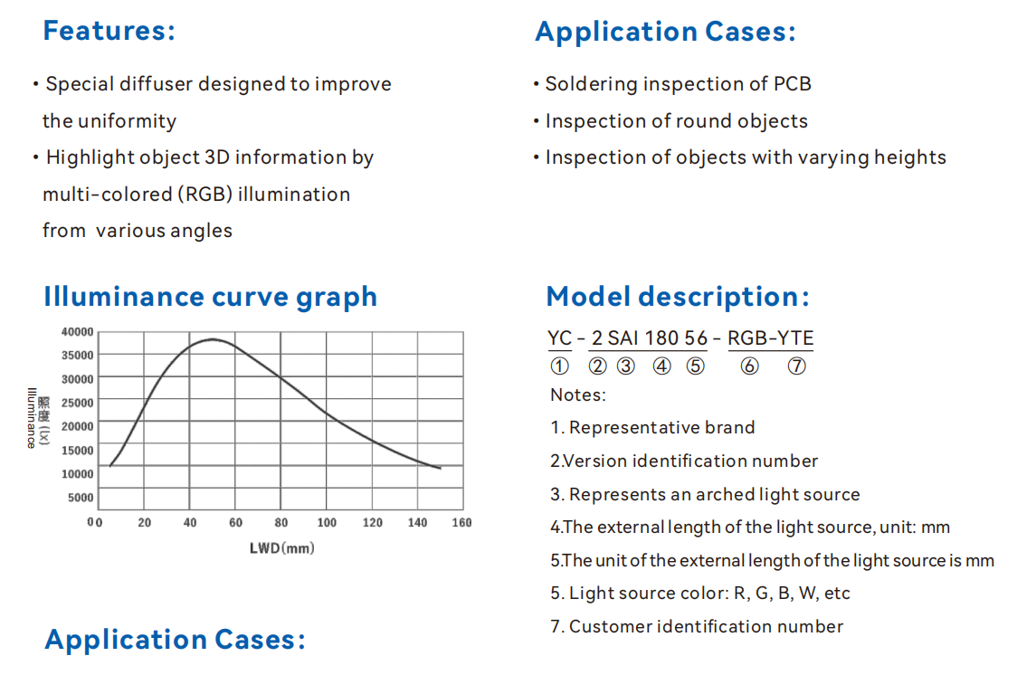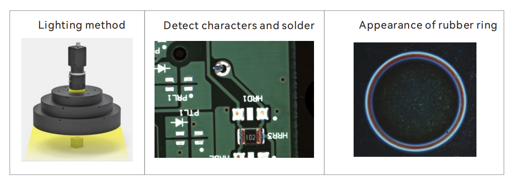 Product Features: Special diffuser designed to improve the uniformity Highlight object 3D information by multi-colored (RGB) illumination from various angles Application Cases: Soldering inspection of PCB Inspection of round objects Inspection of objects with varying heights
