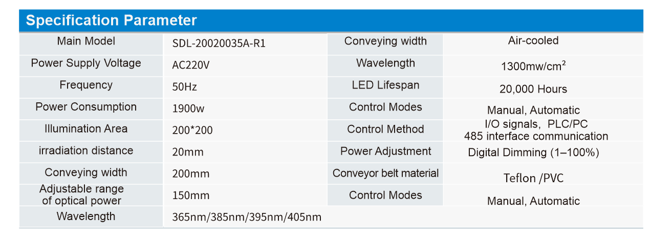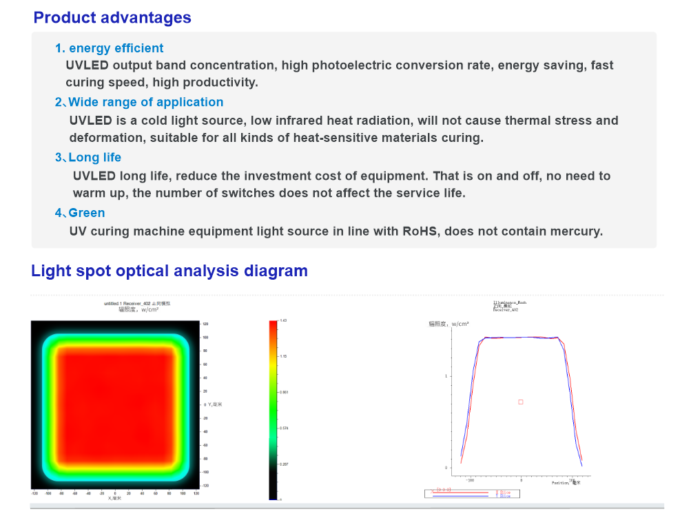 The uvled curing machine equipment supports UVLED current real-time monitoring, UV curing machine fault alarm function and energy-saving protection function. uvled light curing machine equipment provides continuous mode, back-end mode, area mode optional. (Light sources of different wavelengths and size specifications are supported for non-standard customization.)