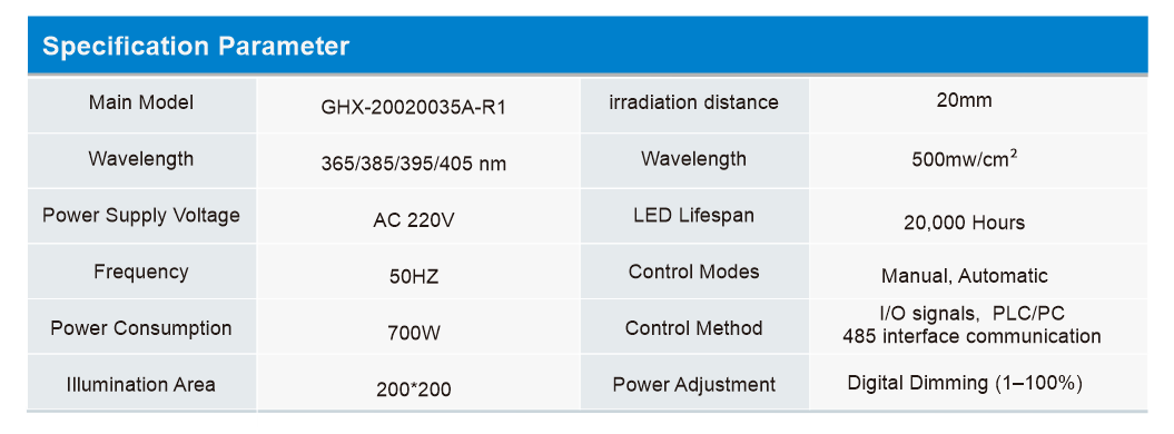 The curing box adopts a modular arrangement, and the light sources are usually selected from 365NM, 385NM, 395NM, 405NM, etc. It can be self-oiled to combine various wavelengths. The light output Angle, distance and range can all be customized according to customer requirements. The UV LED curing system is easy to operate and lights up immediately upon startup, eliminating the need for standby power consumption and enhancing production efficiency. The light output is stable and uniform, and the uniform irradiation effect is good.