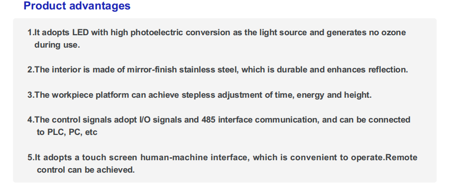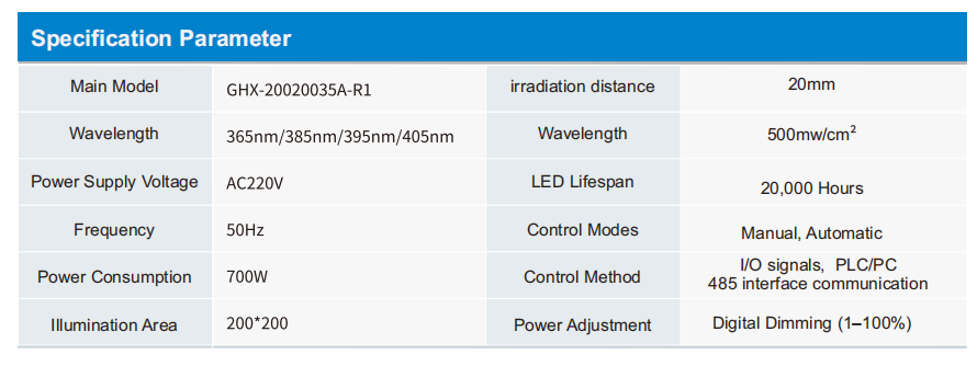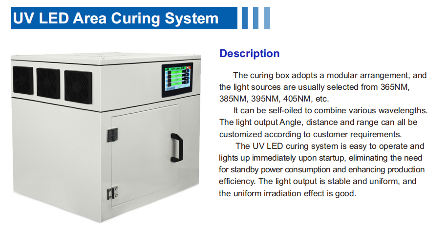 The curing box adopts a modular arrangement, and the light sources are usually selected from 365NM, 385NM, 395NM, 405NM, etc. It can be self-oiled to combine various wavelengths. The light output Angle, distance and range can all be customized according to customer requirements. The UV LED curing system is easy to operate and lights up immediately upon startup, eliminating the need for standby power consumption and enhancing production efficiency. The light output is stable and uniform, and the uniform irradiation effect is good
