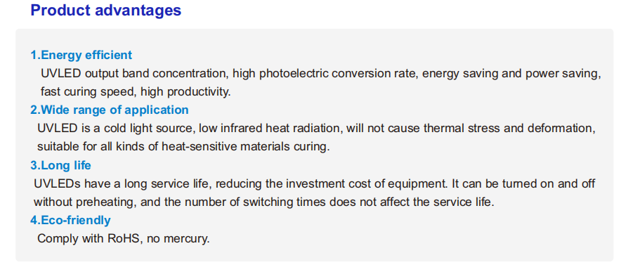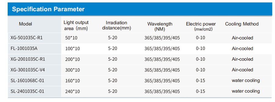 Yongcheng independently developed and produced a high-performance UVLED line light source curing system. The system includes a controller and a UVLED line light source irradiation head, as well as a heat dissipation method. Air cooling and water cooling are available. It can be matched with production lines and supports external signal input and triggering.